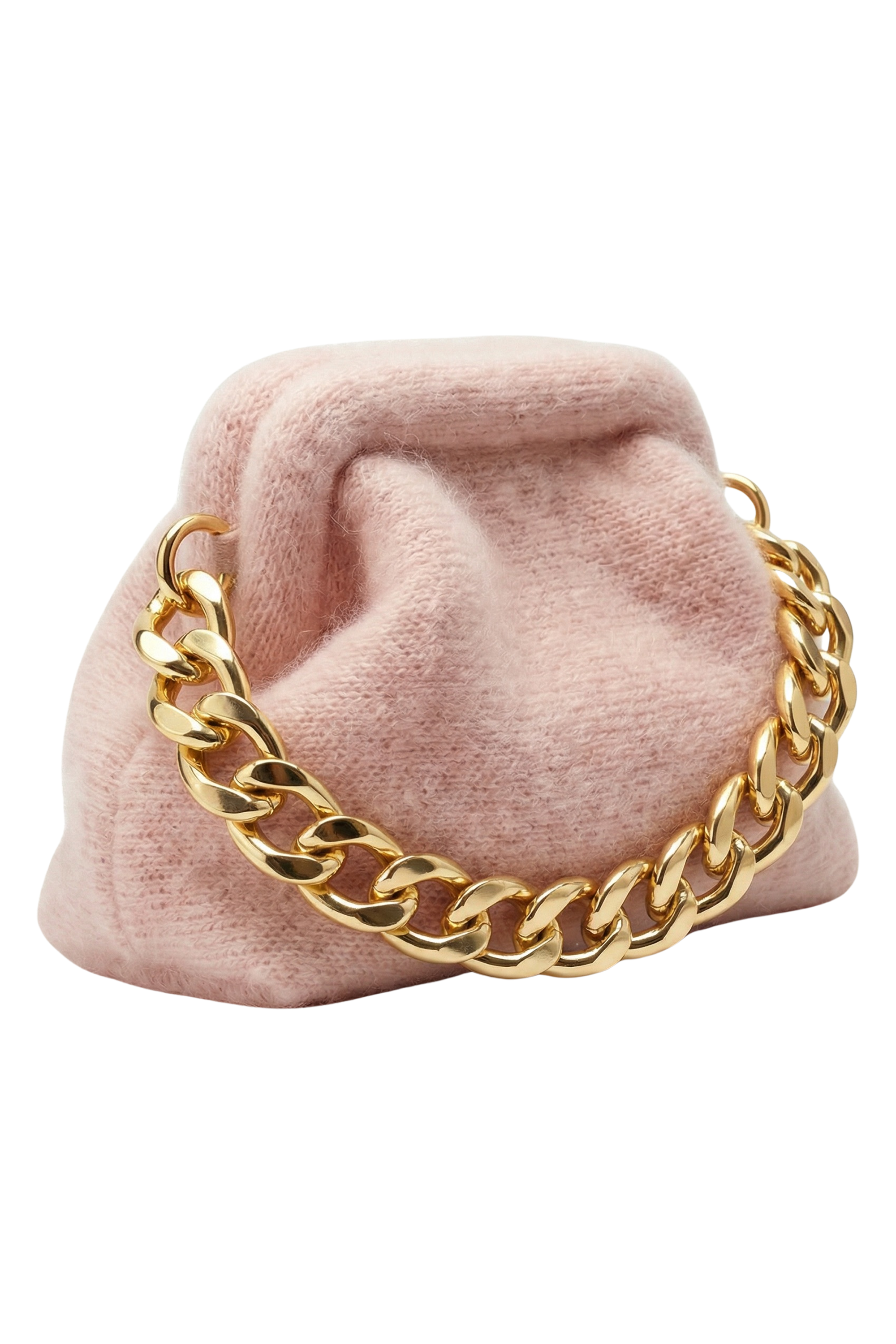 The oversized gold chain is more than a strap. It is statement hardware. Each link is smooth, rounded, and richly plated, reflecting light with a liquid glow against the matte softness of the mohair. The contrast between plush textile and luminous metal creates a refined tension that feels both modern and timeless.